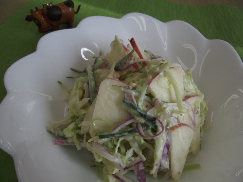 ①キャベツは太めのせん切り、紫玉ねぎは薄切りに。きゅうりは縦半分に切ってから斜め薄切り、セロリも斜め薄切りにする。
