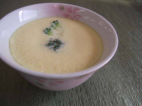 ③蒸し茶碗にチーズとブロッコリーとエビを等分に入れ、②を静かに注ぐ。